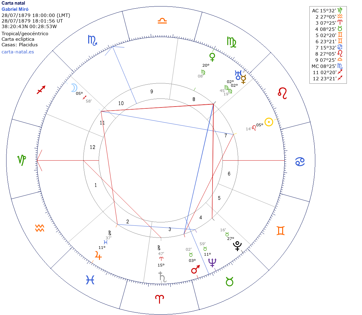 Gabriel Miró nació el 28 de Julio de 1879 a las 18:00:00 en Alacant (Alicante), España