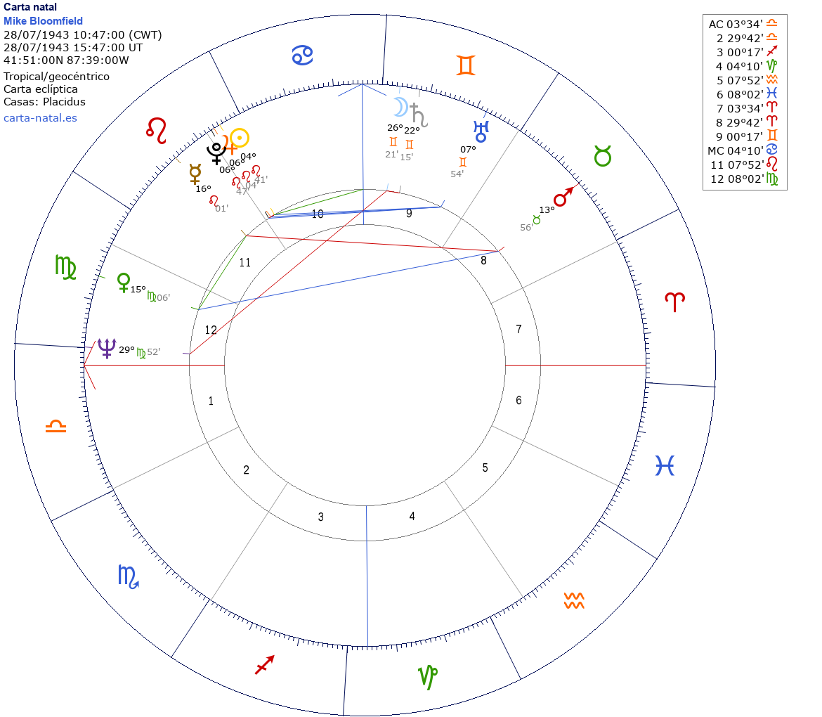 Esta es la carta natal de Mike Bloomfield, músico estadounidense.