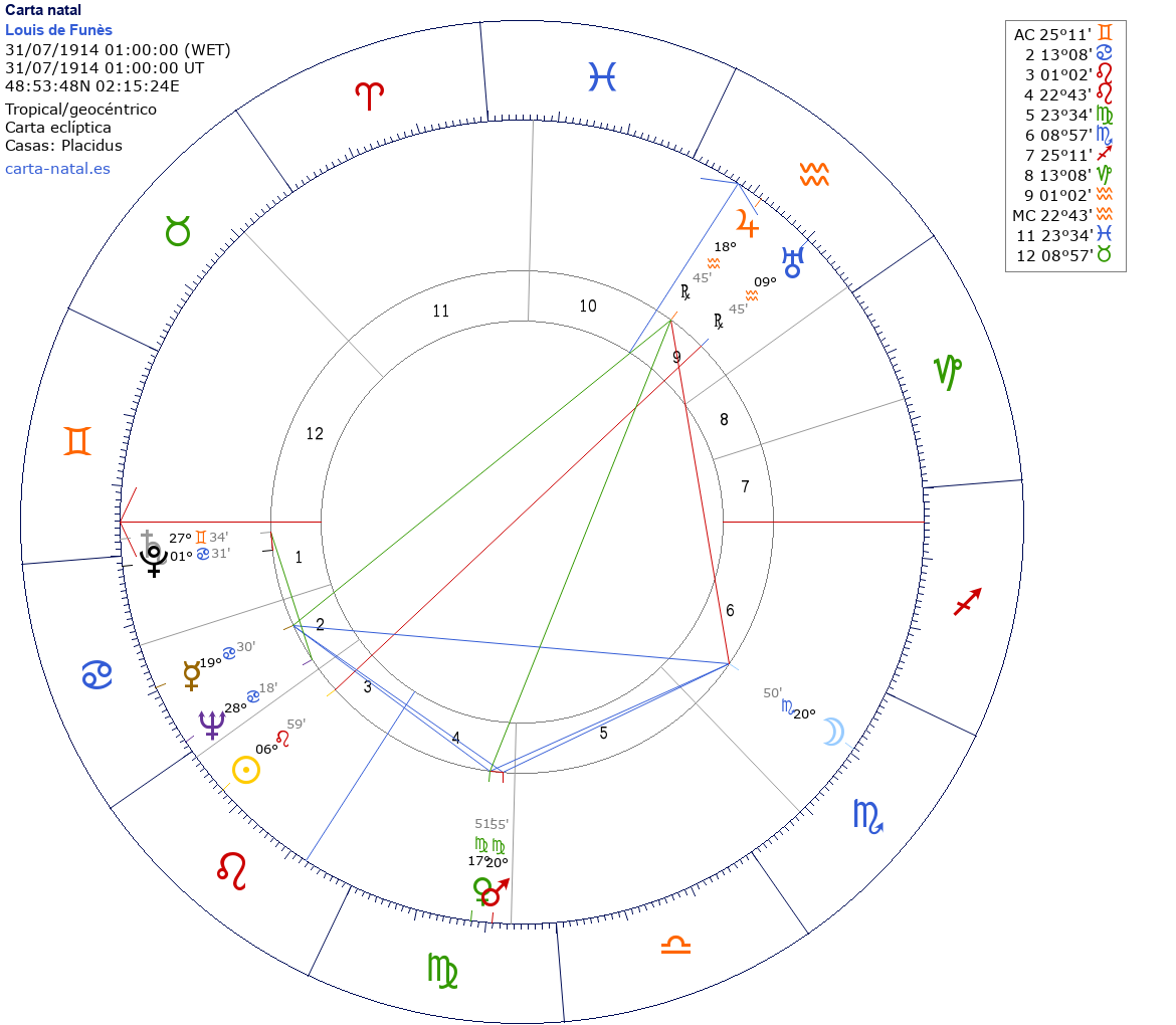 Esta es la carta natal de Louis de Funès, actor cómico francés.