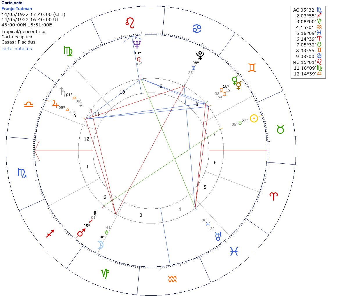 Franjo Tudman nació el 14 de Mayo de 1922 a las 17:40:00 en Veliko Trgovisce (Krapina-Zagorje), Croacia