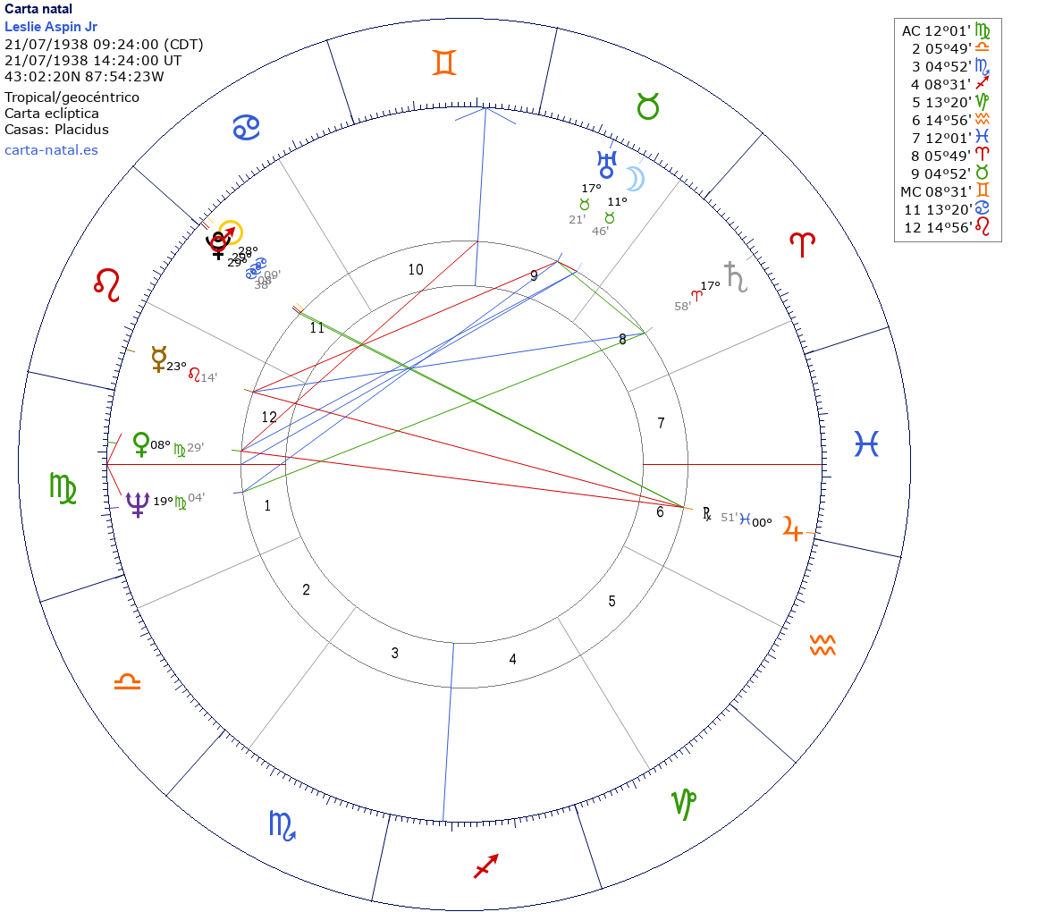 Esta es la carta natal de Leslie Aspin Jr, político, Secretario de Defensa de EE.UU.