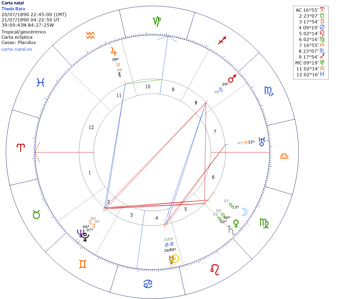Esta es la carta natal de Theda Bara, actriz estadounidense.
