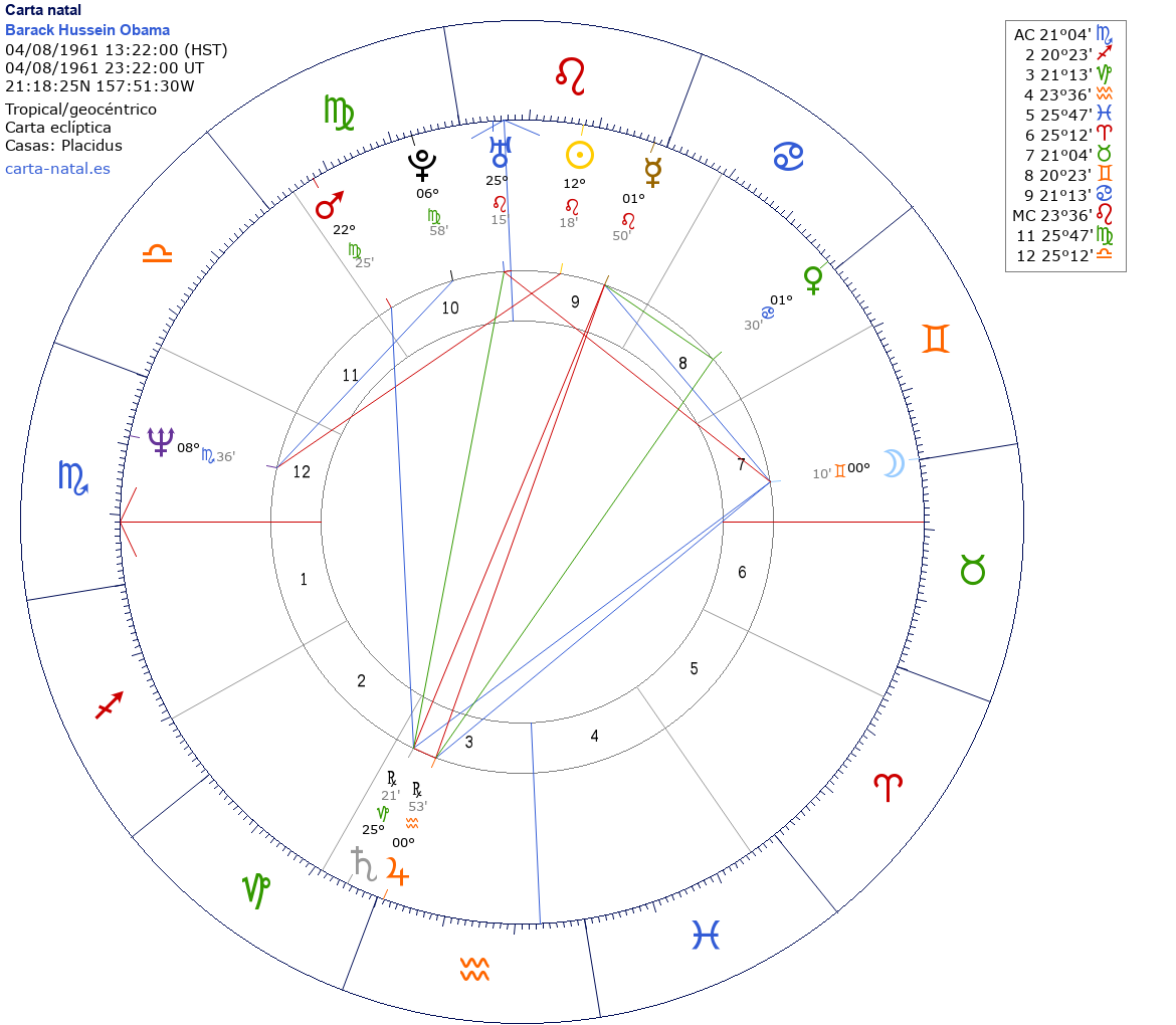 Barack Hussein Obama nació el 4 de Agosto de 1961 a las 13:22:00 en Honolulu (Honolulu HI), Estados Unidos