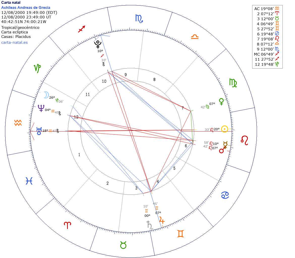 Esta es la carta natal de Achileas Andreas, tercer hijo de los príncipes Pablo y Marie-Chantal de Grecia.