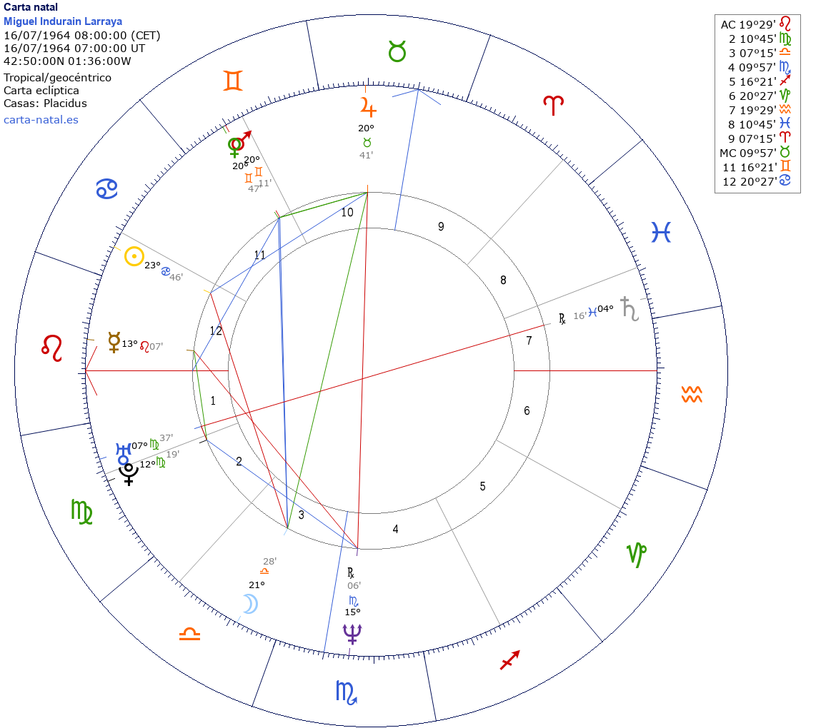 Miguel Indurain Larraya nació el 16 de Julio de 1964 a las 08:00:00 en Atarrabia (Navarra), España