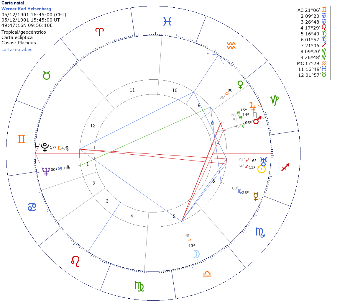Esta es la carta natal de Werner Karl Heisenberg, físico alemán inventor de la mecánica cuántica matricial, Premio Nobel de Física en 1932.