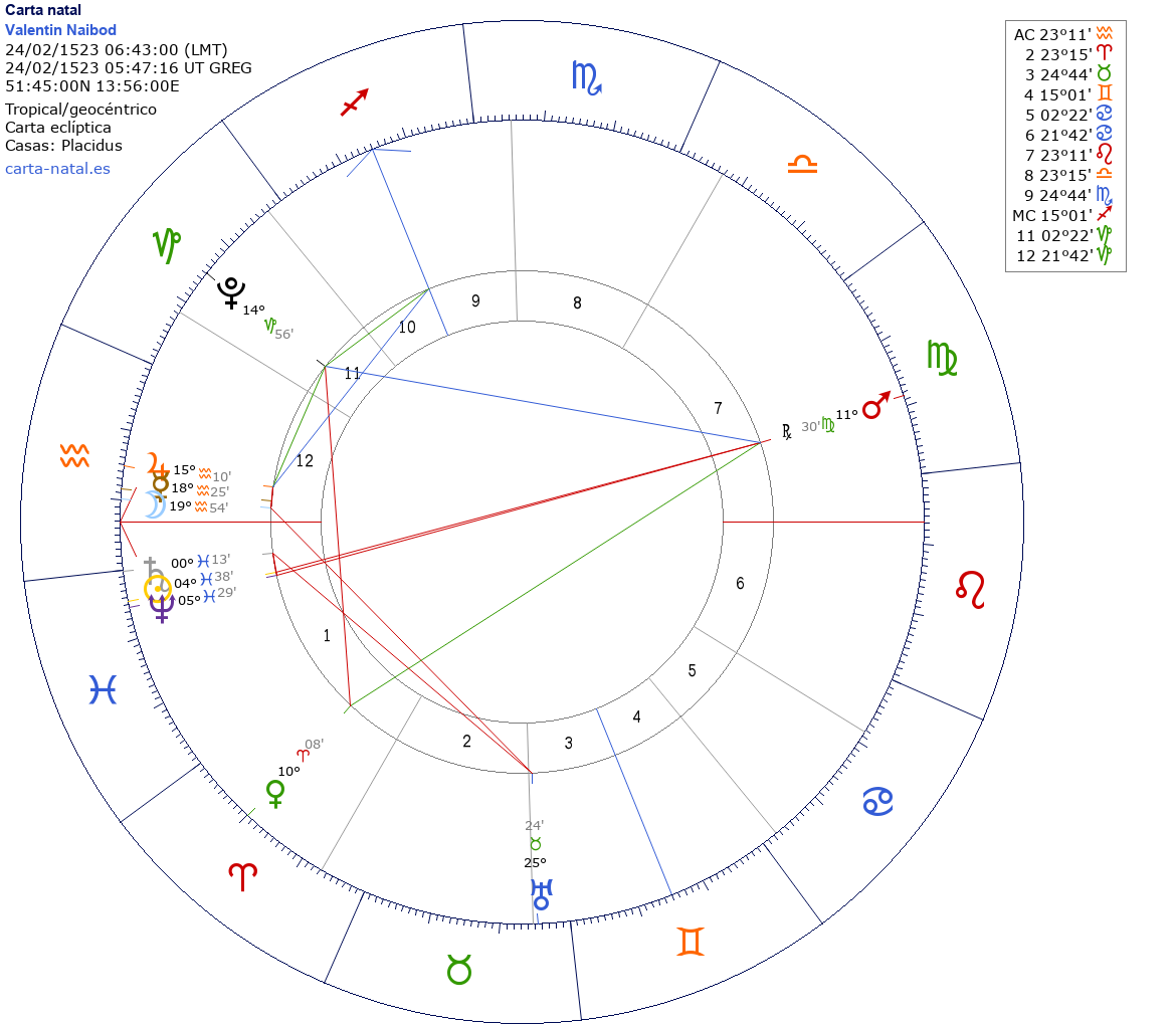 Valentin Naibod nació el 14 de Febrero de 1523 a las 06:43:00 en Calau (Brandeburgo), Alemania