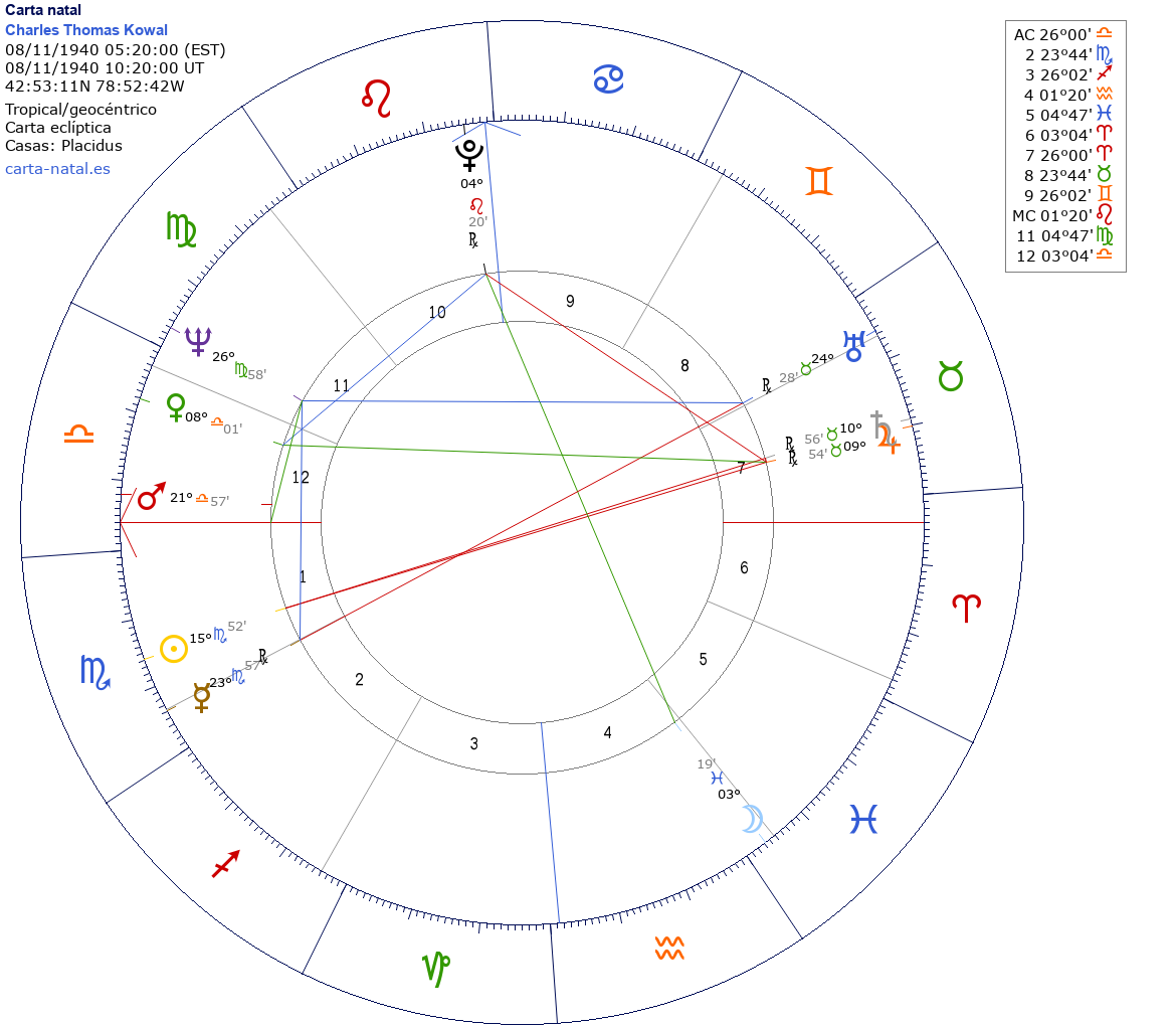 Esta es la carta natal de Charles Thomas Kowal, astrónomo estadounidense descubridor de los satélites de Júpiter Leda y Temisto y del asteroide Quirón, entre otros.
