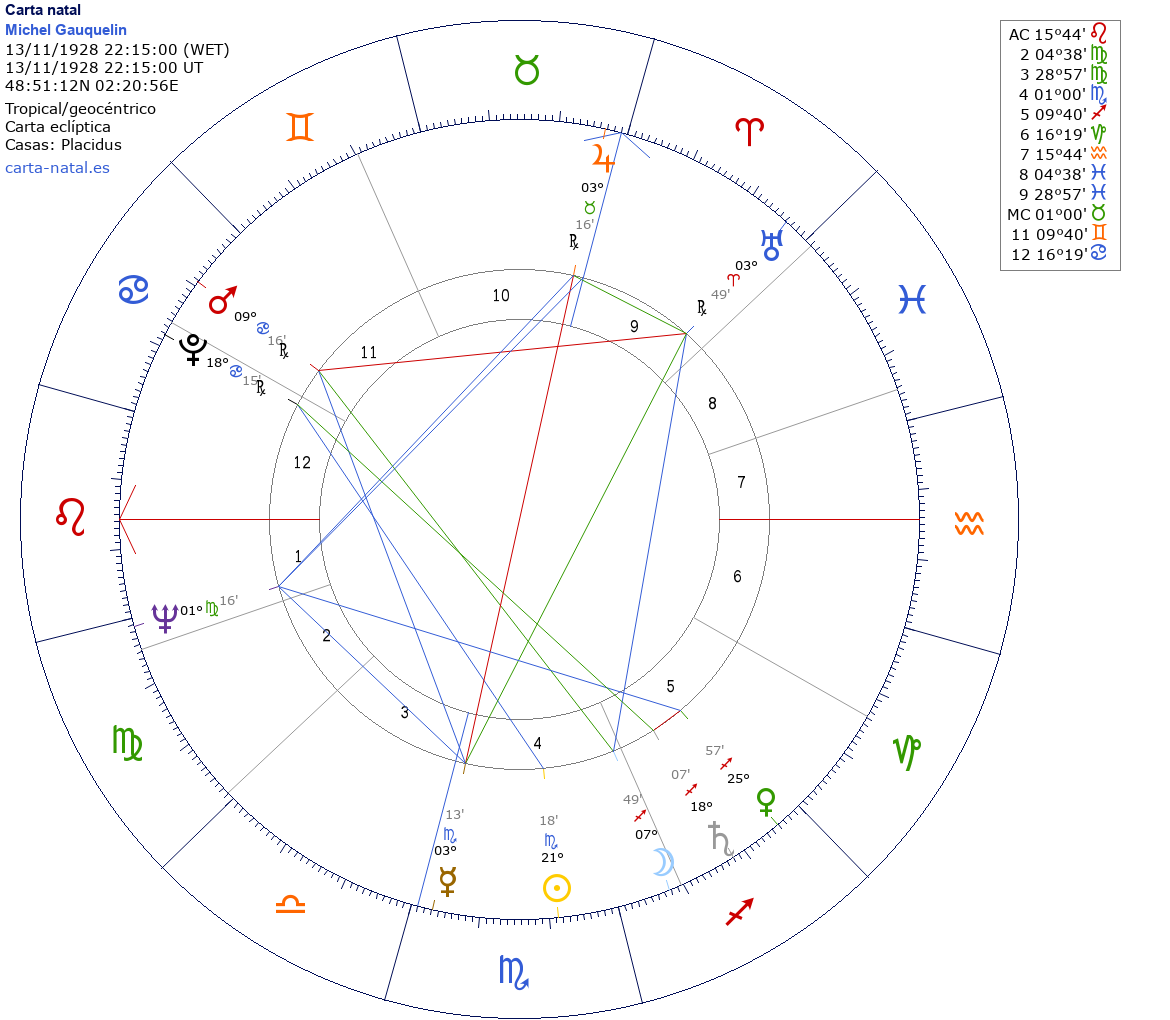 Michel Gauquelin nació el 13 de Noviembre de 1928 a las 22:15:00 en Paris (Isla de Francia), Francia