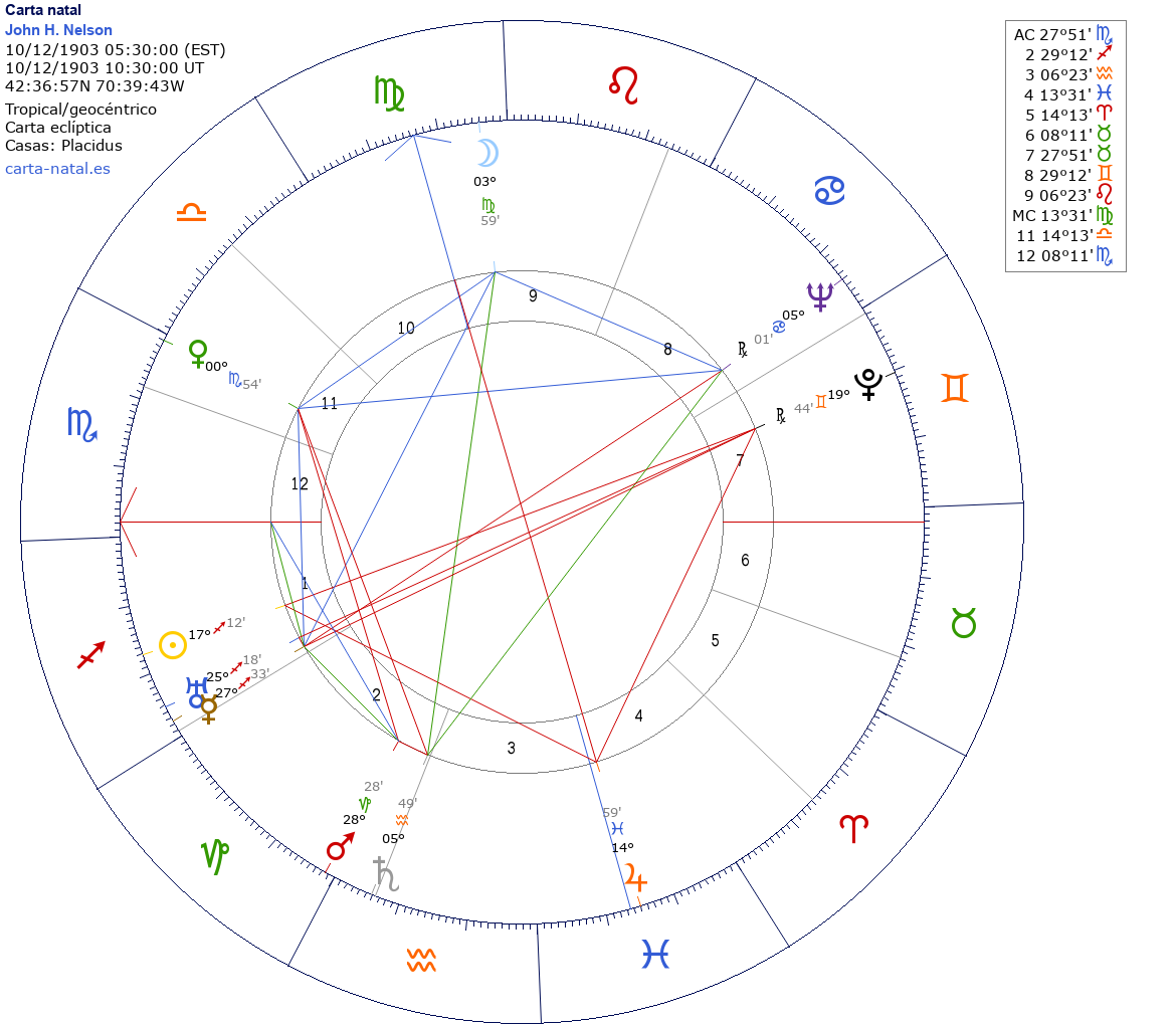 Esta es la carta natal de John H. Nelson, ingeniero de radio estadounidense que investigó la relación entre los planetas y la actividad solar.