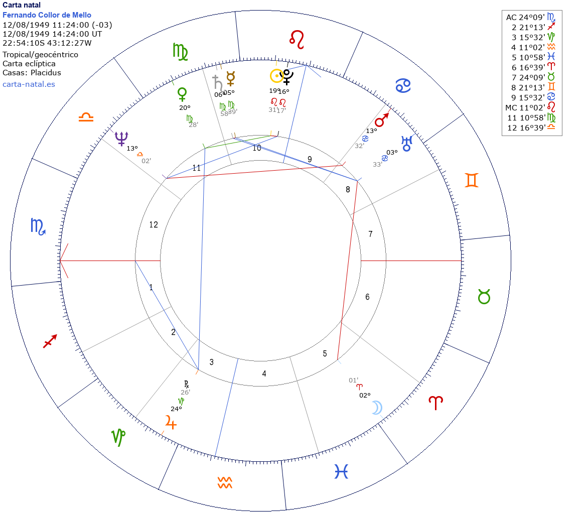 Fernando Collor de Mello nació el 12 de Agosto de 1949 a las 11:24:00 en Rio de Janeiro (Rio de Janeiro), Brasil