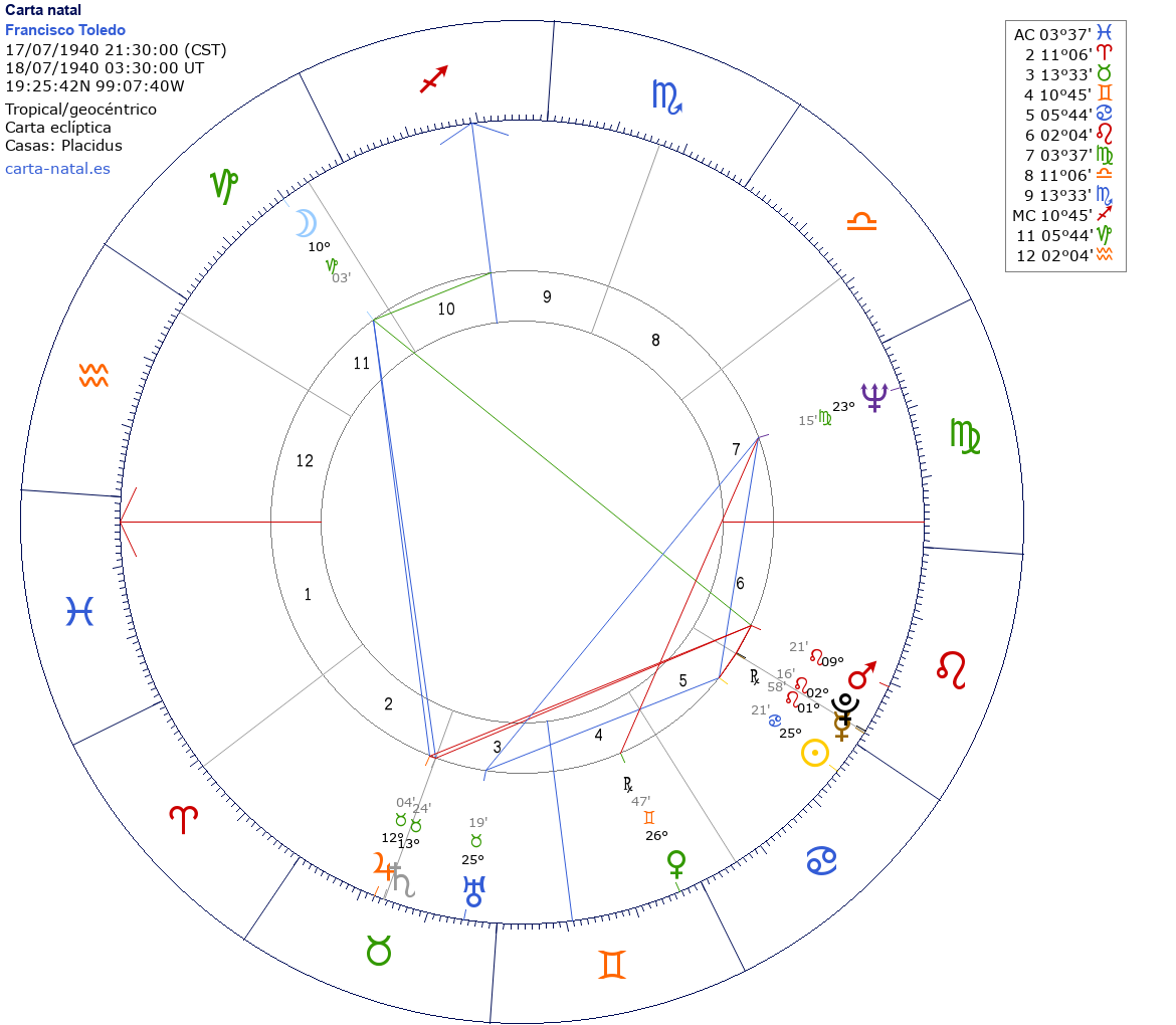Francisco Toledo nació el 17 de Julio de 1940 a las 21:30:00 en Ciudad de México (Distrito Federal), México