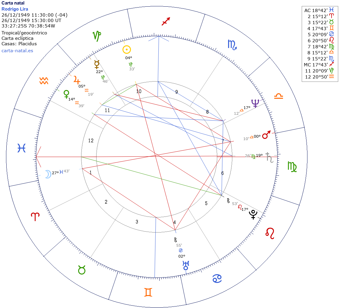 Rodrigo Lira nació el 26 de Diciembre de 1949 a las 11:30:00 en Santiago de Chile (Región Metropolitana), Chile