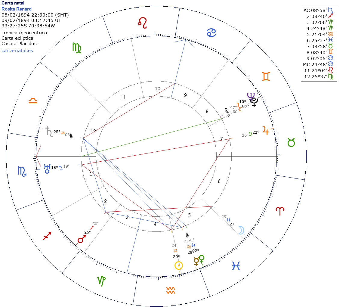 Rosita Renard nació el 8 de Febrero de 1894 a las 22:30:00 en Santiago de Chile (Región Metropolitana), Chile