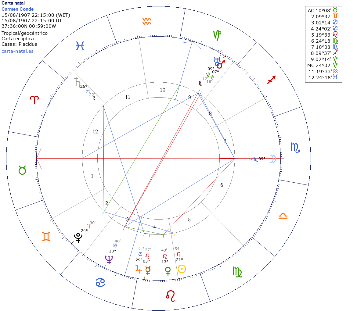 Carmen Conde nació el 15 de Agosto de 1907 a las 22:15:00 en Cartagena (Murcia), España