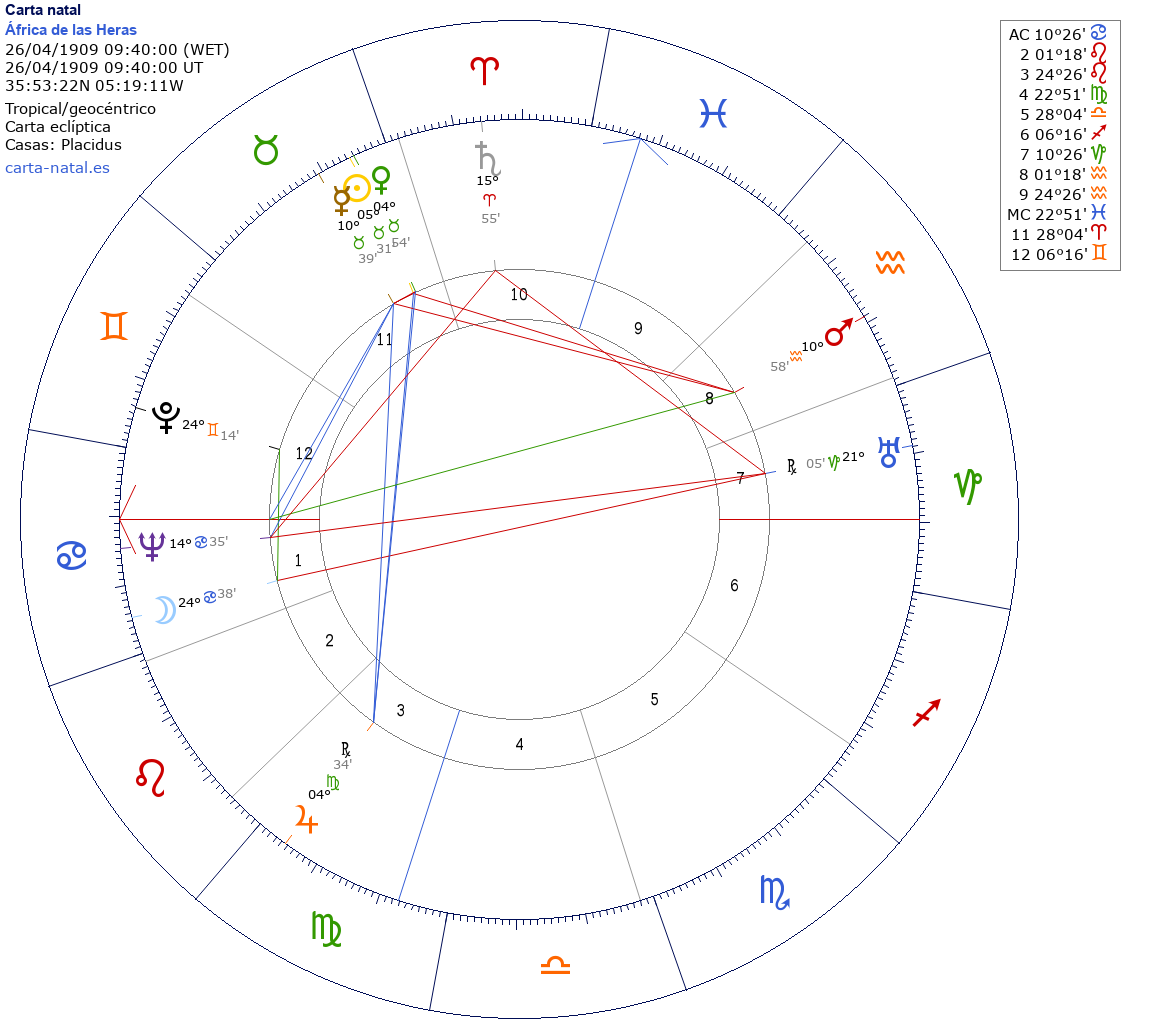 África de las Heras nació el 26 de Abril de 1909 a las 09:40:00 en Ceuta (Ceuta), España
