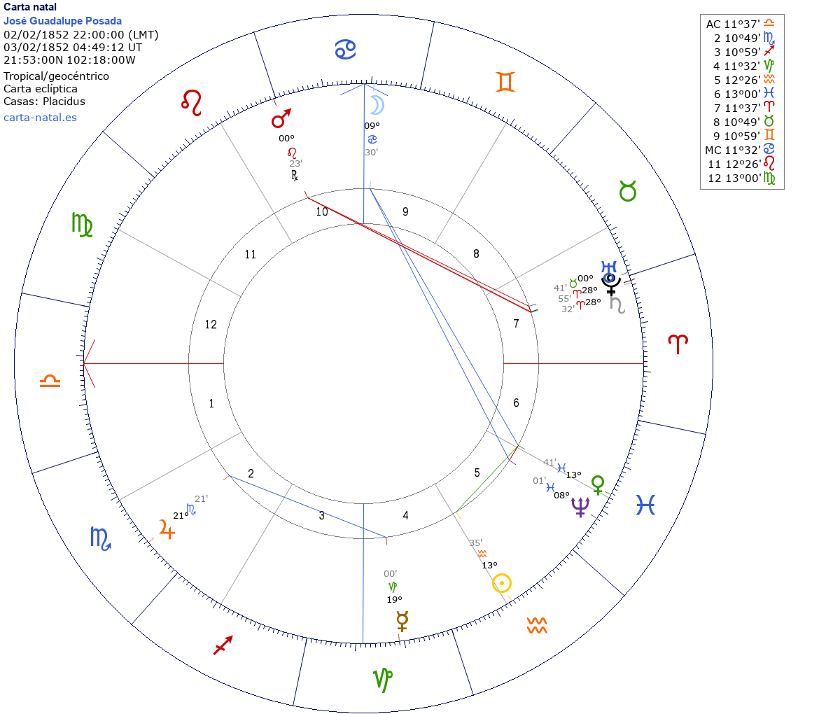 José Guadalupe Posada nació el 2 de Febrero de 1852 a las 22:00:00 en Aguascalientes (Aguascalientes), México