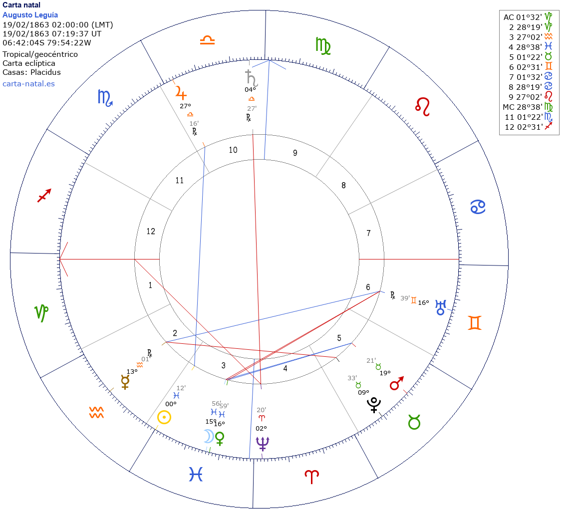 Augusto Leguía nació el 19 de Febrero de 1863 a las 02:00:00 en Lambayeque (Lambayeque), Perú