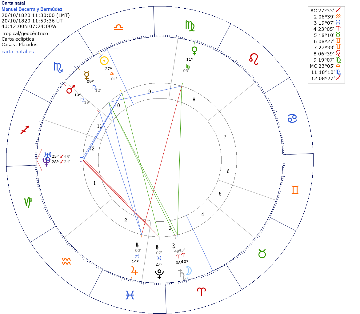 Esta es la carta natal de Manuel Becerra y Bermúdez, matemático y político español, Gran Maestro de la gran logia Gran Oriente de España.