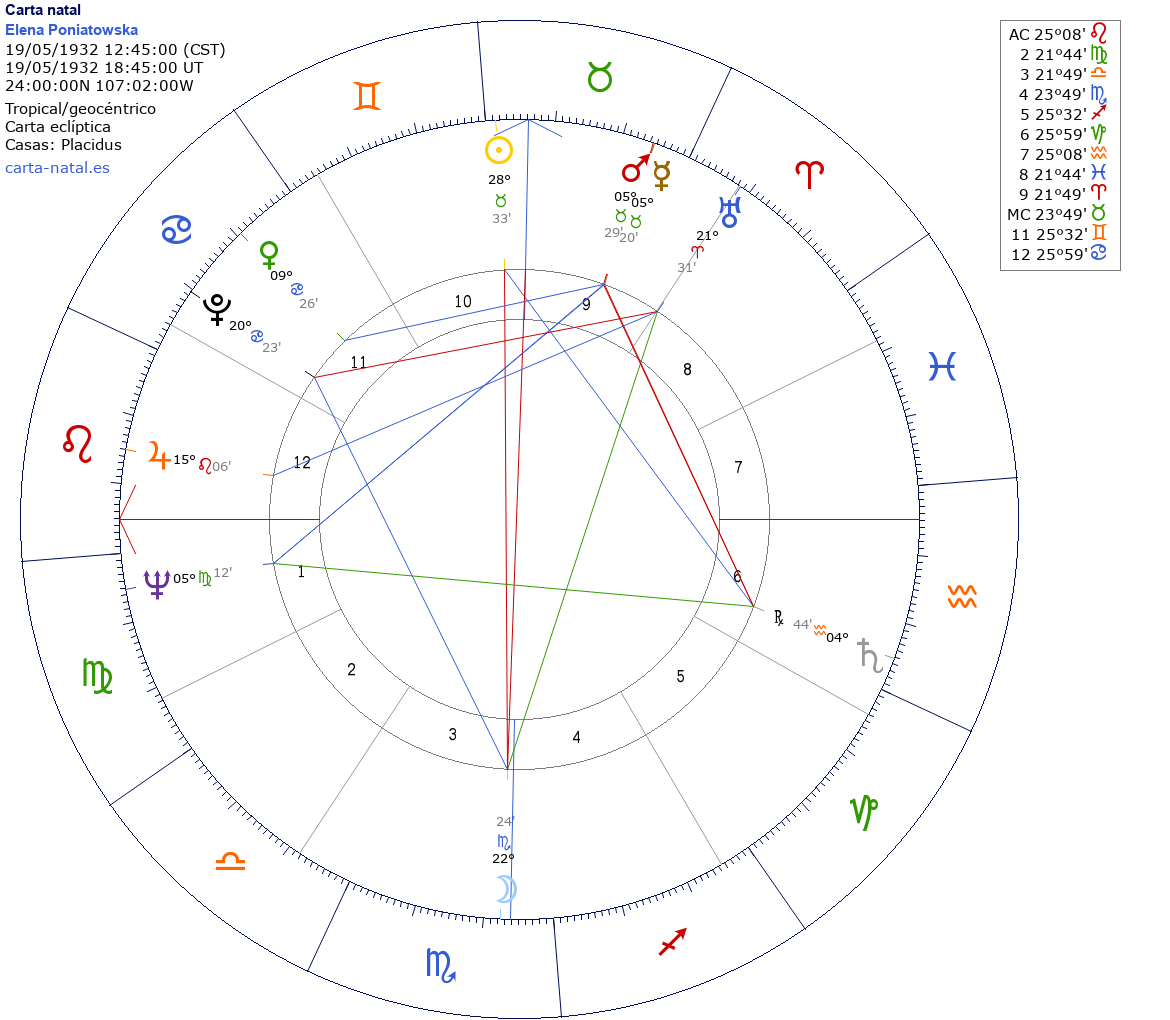 Elena Poniatowska nació el 19 de Mayo de 1932 a las 12:45:00 en Culiacan (Sinaloa), México