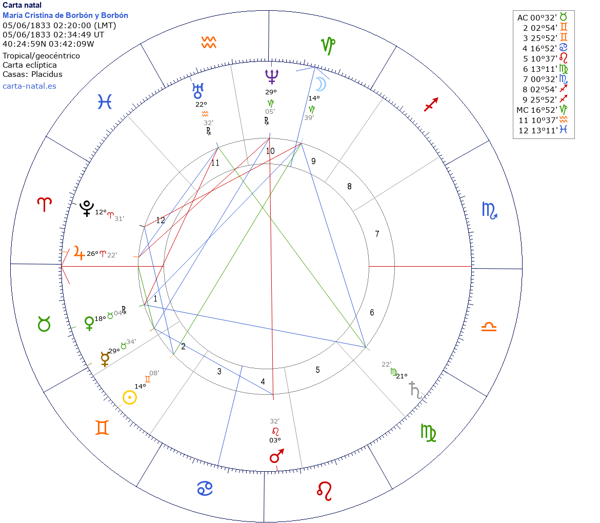 Esta es la carta natal de María Cristina de Borbón y Borbón-Dos Sicilias, infanta de España, popularmente apodada "La Infanta Boba".