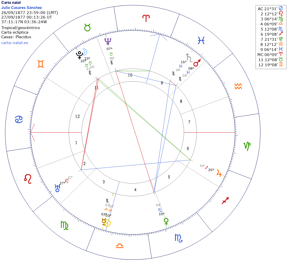 Julio Casares Sánchez nació el 26 de Septiembre de 1877 a las 23:59:00 en Granada (Granada), España