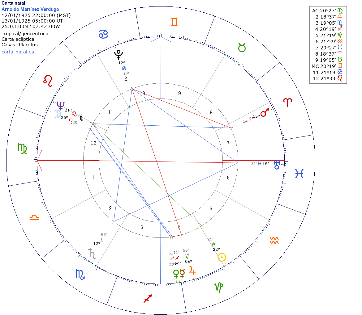 Arnoldo Martínez Verdugo nació el 12 de Enero de 1925 a las 22:00:00 en Pericos (Sinaloa), México