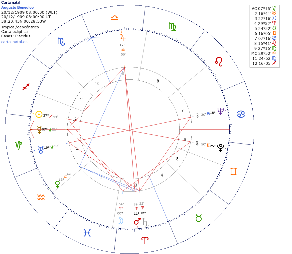 Esta es la carta natal de Augusto Benedico (nombre artístico de Augusto Pérez Lías), actor español que desarrolló la mayor parte de su carrera en México.
