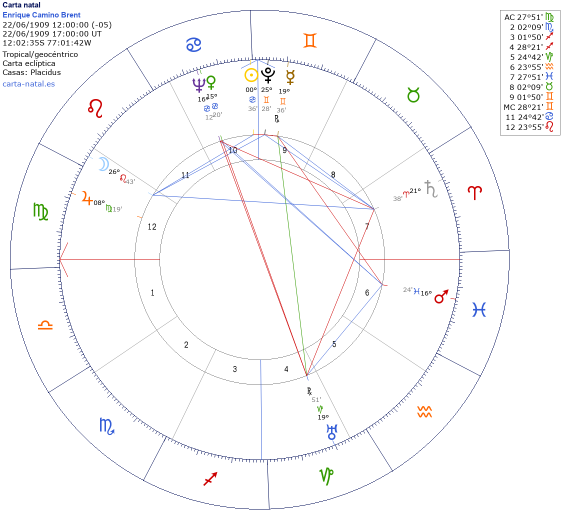Enrique Camino Brent nació el 22 de Junio de 1909 a las 12:00:00 en Lima (Lima), Perú