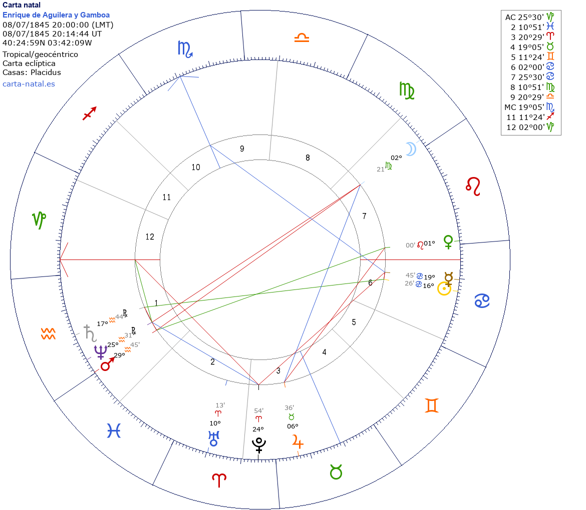 Enrique de Aguilera y Gamboa nació el 8 de Julio de 1845 a las 20:00:00 en Madrid (Madrid), España