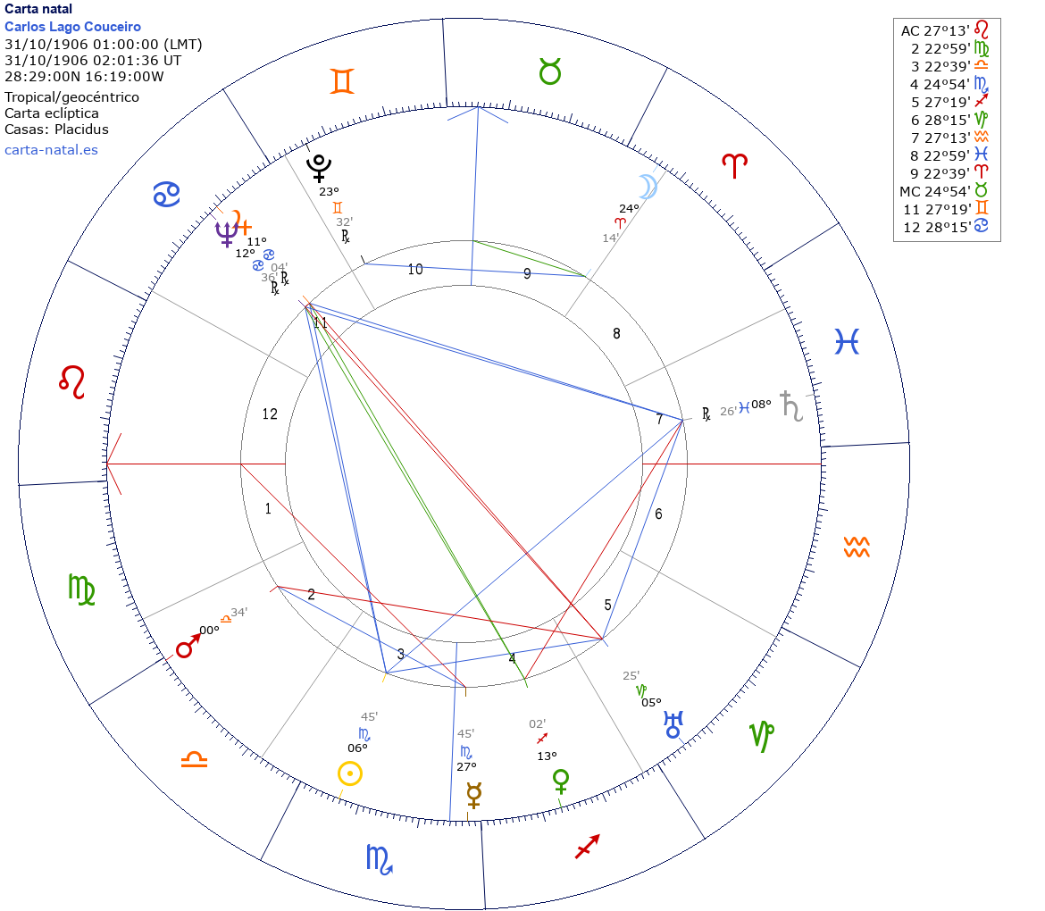 Carlos Lago Couceiro nació el 31 de Octubre de 1906 a las 01:00:00 en San Cristóbal de La Laguna (Santa Cruz de Tenerife), España
