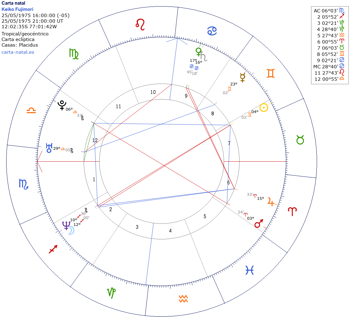 Esta es la carta natal de Keiko Fujimori, política peruana, Primera Dama del Perú (1994-2000) y Presidenta de la Fundación por los Niños del Perú.