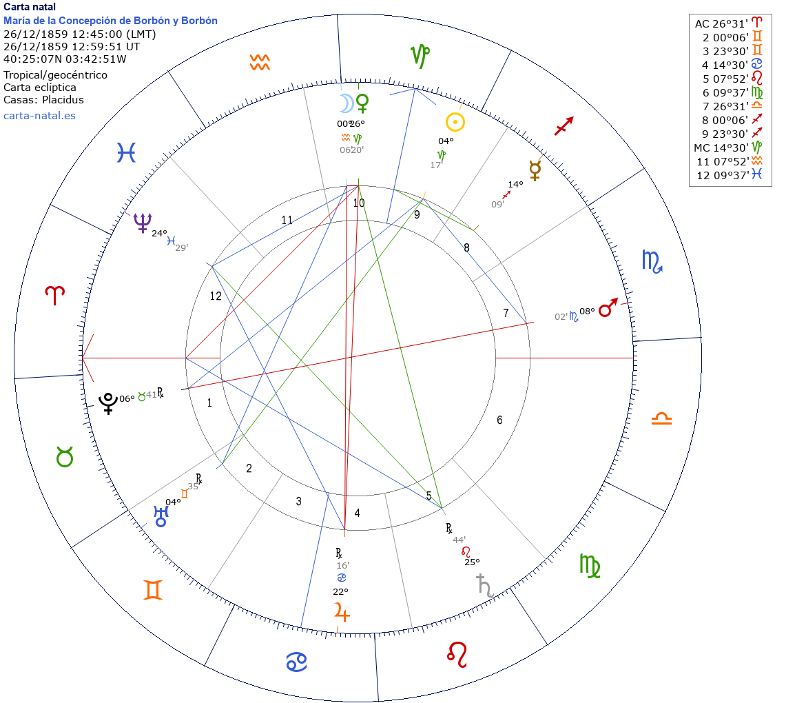 María de la Concepción de Borbón y Borbón nació el 26 de Diciembre de 1859 a las 12:45:00 en Palacio Real de Madrid (Madrid), España