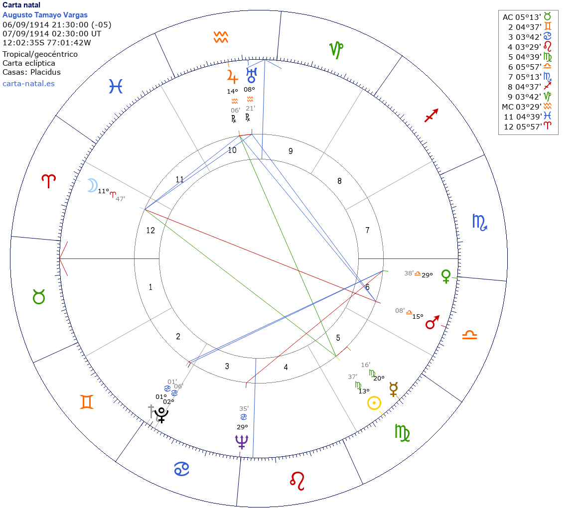 Augusto Tamayo Vargas nació el 6 de Septiembre de 1914 a las 21:30:00 en Lima (Lima), Perú