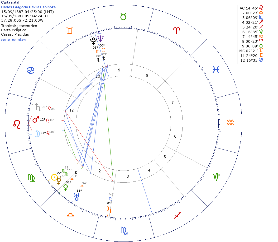 Carlos Gregorio Dávila Espinoza nació el 15 de Septiembre de 1887 a las 04:25:00 en Los Angeles (Biobío), Chile