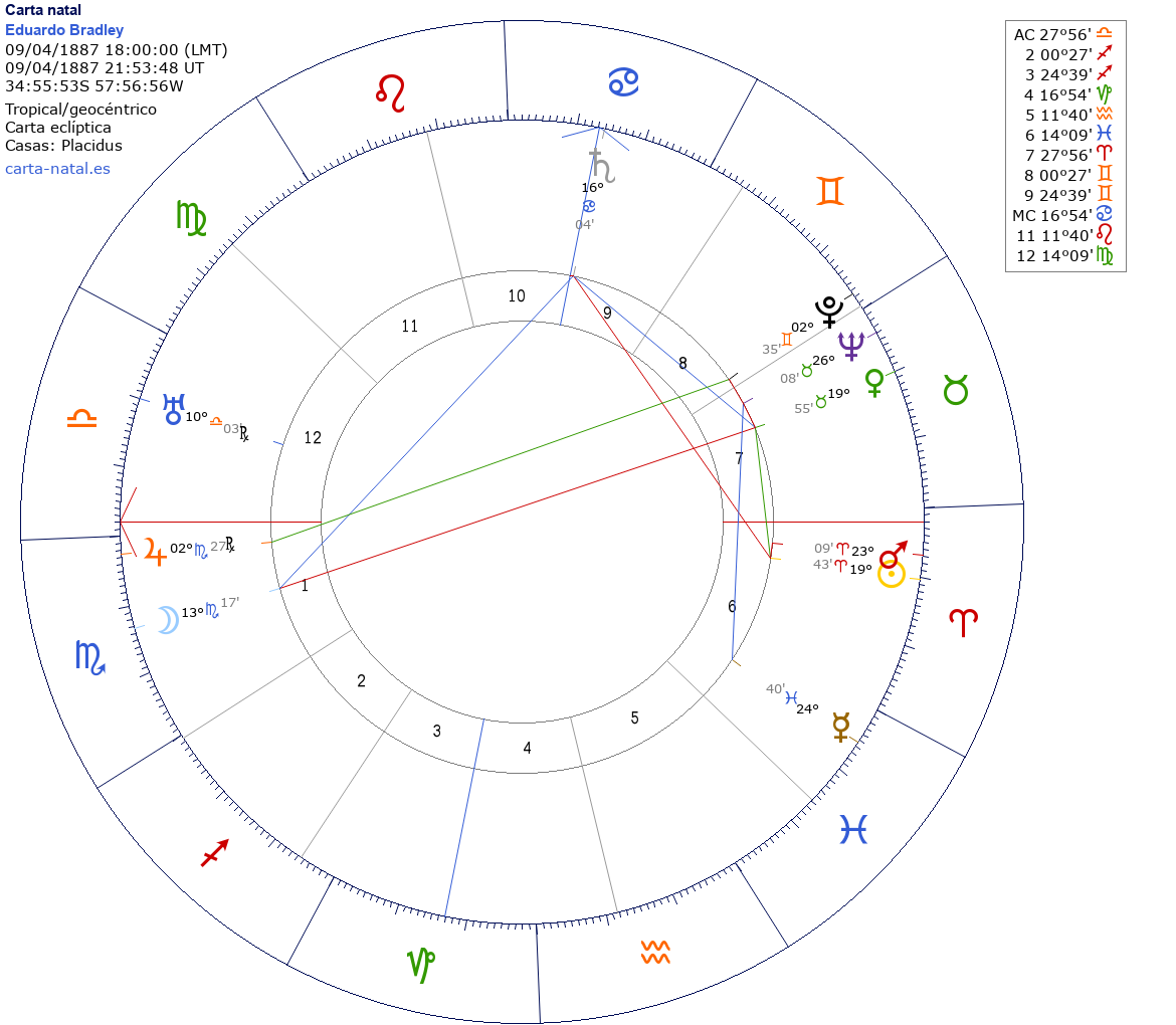 Eduardo Bradley nació el 9 de Abril de 1887 a las 18:00:00 en La Plata (Buenos Aires), Argentina