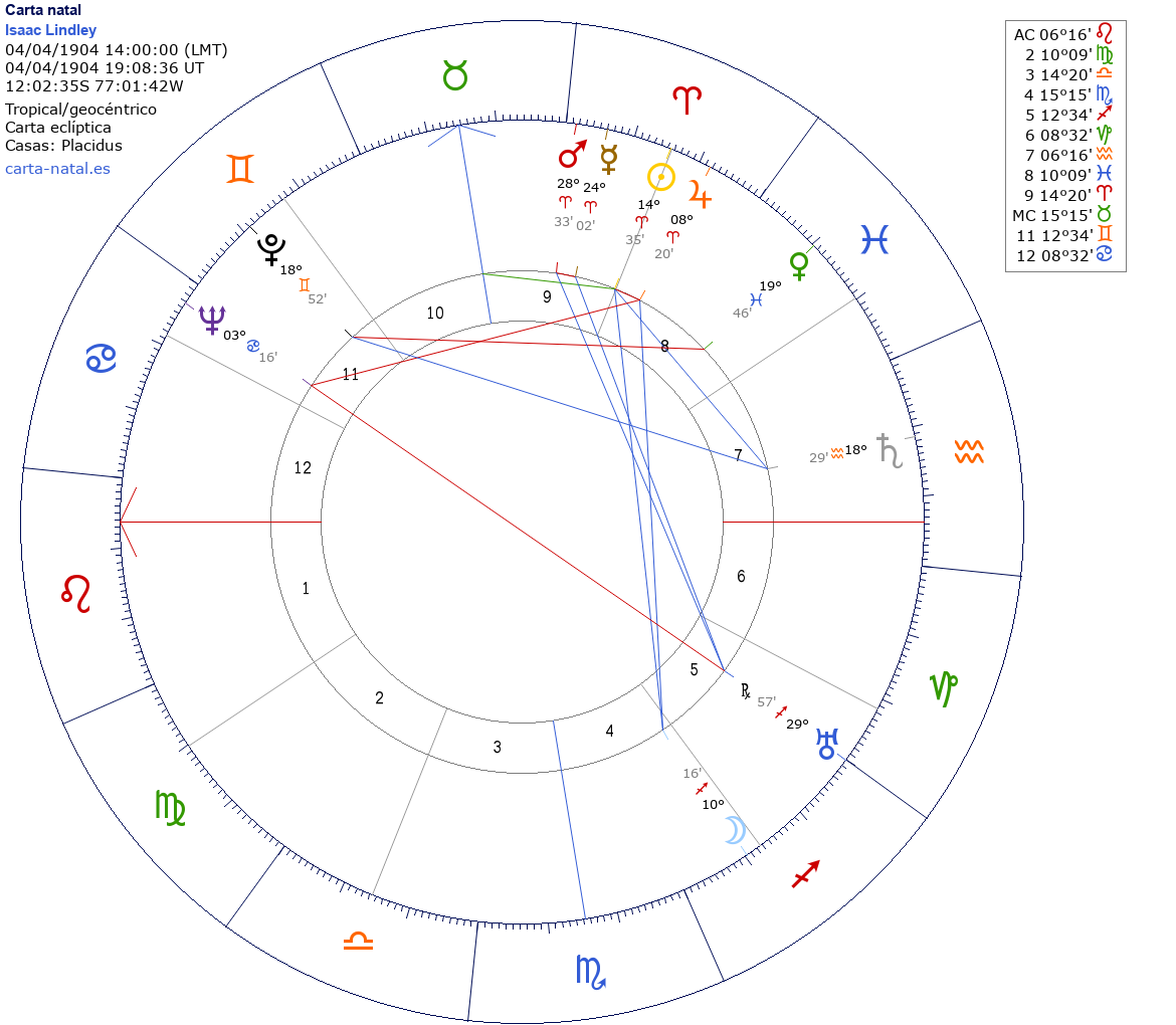 Isaac Lindley nació el 4 de Abril de 1904 a las 14:00:00 en Lima (Lima), Perú