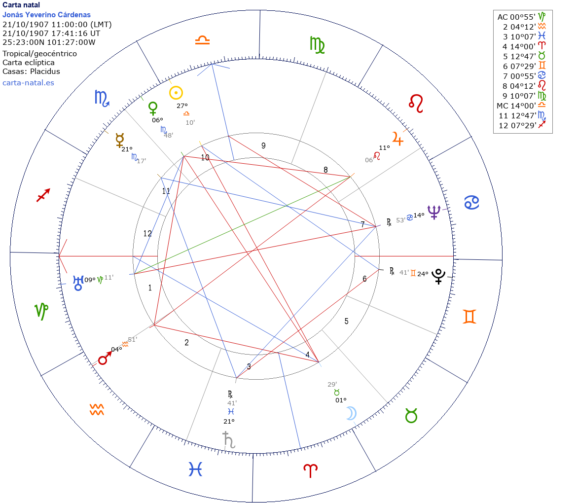 Esta es la carta natal de Jonás Yeverino Cárdenas, músico mexicano.