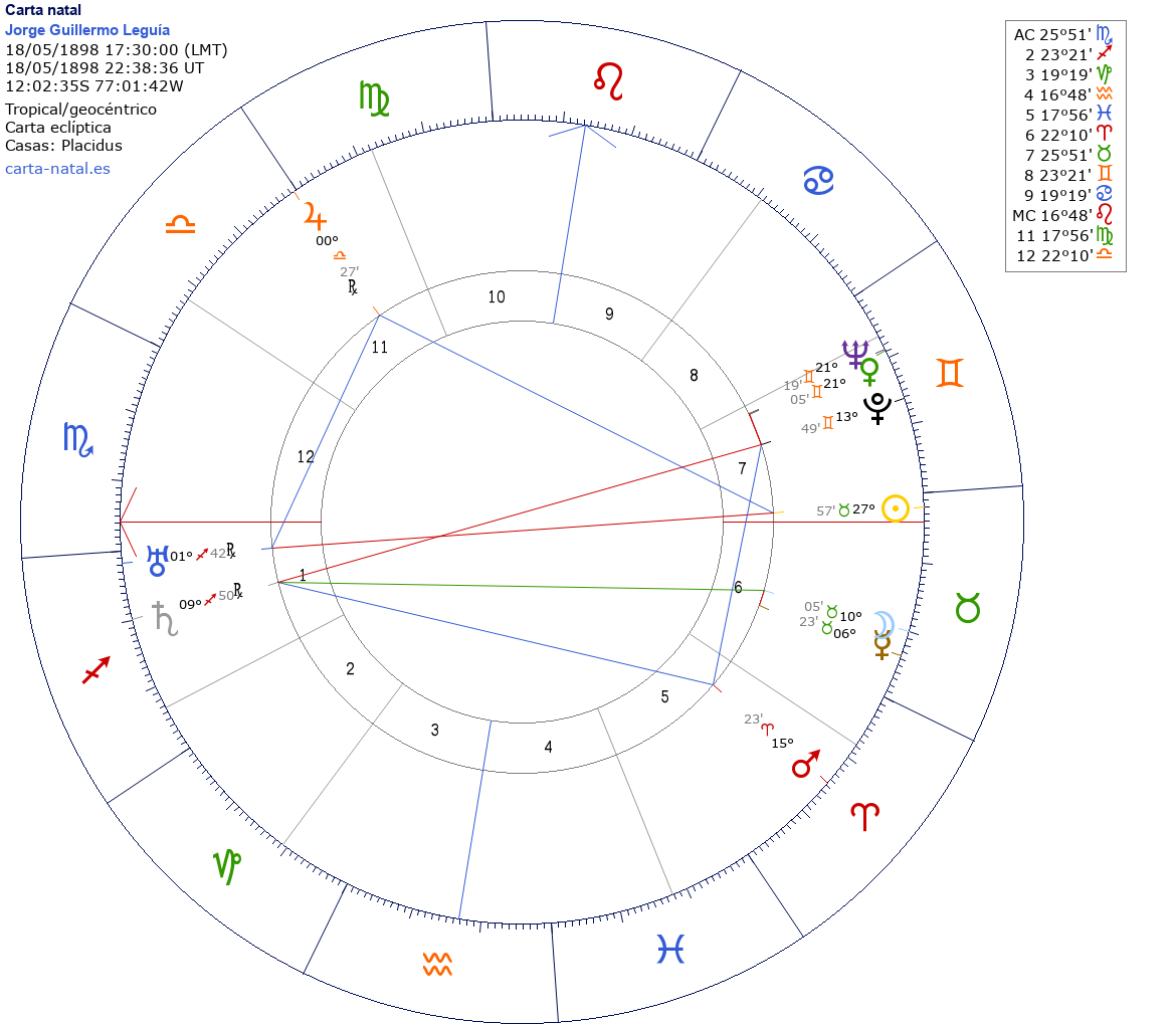 Jorge Guillermo Leguía nació el 18 de Mayo de 1898 a las 17:30:00 en Lima (Lima), Perú