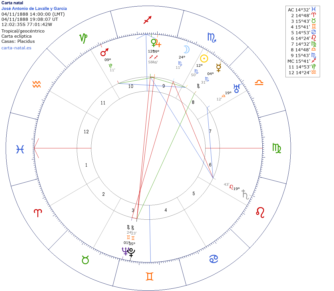 José Antonio de Lavalle y García nació el 4 de Noviembre de 1888 a las 14:00:00 en Lima (Lima), Perú