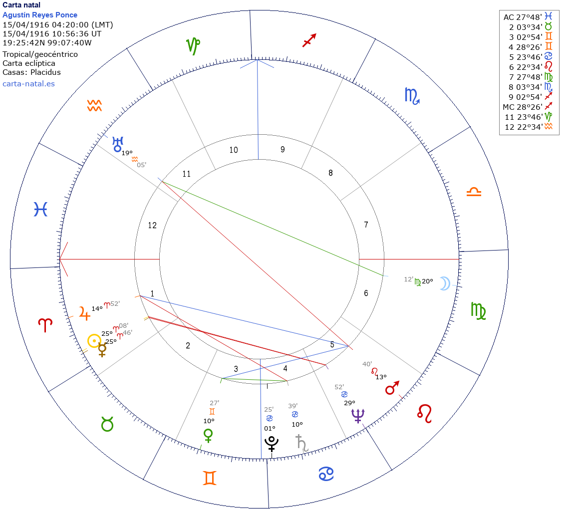 Agustín Reyes Ponce nació el 15 de Abril de 1916 a las 04:20:00 en Ciudad de México (Distrito Federal), México