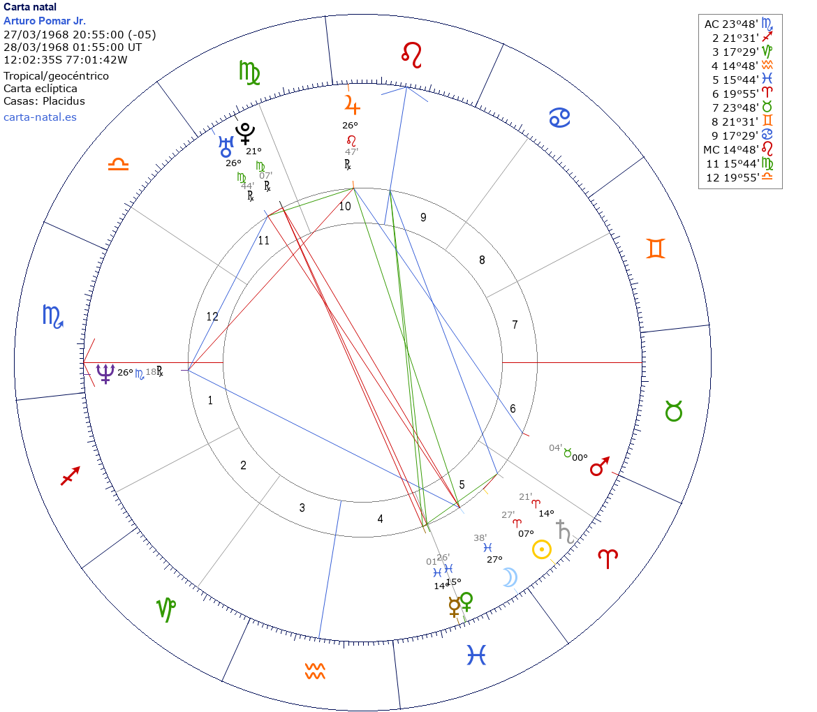 Arturo Pomar Jr. nació el 27 de Marzo de 1968 a las 20:55:00 en Lima (Lima), Perú