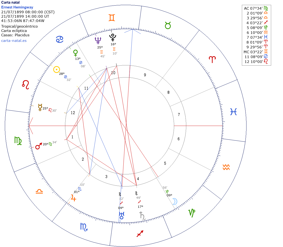 Ernest Hemingway nació el 21 de Julio de 1899 a las 08:00:00 en Oak Park (Cook IL), Estados Unidos