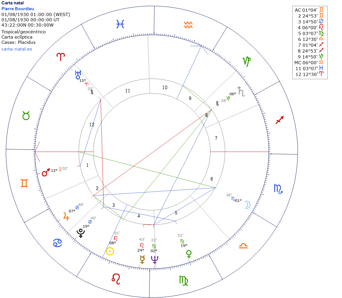 Esta es la carta natal de Pierre Bourdieu, sociólogo francés.