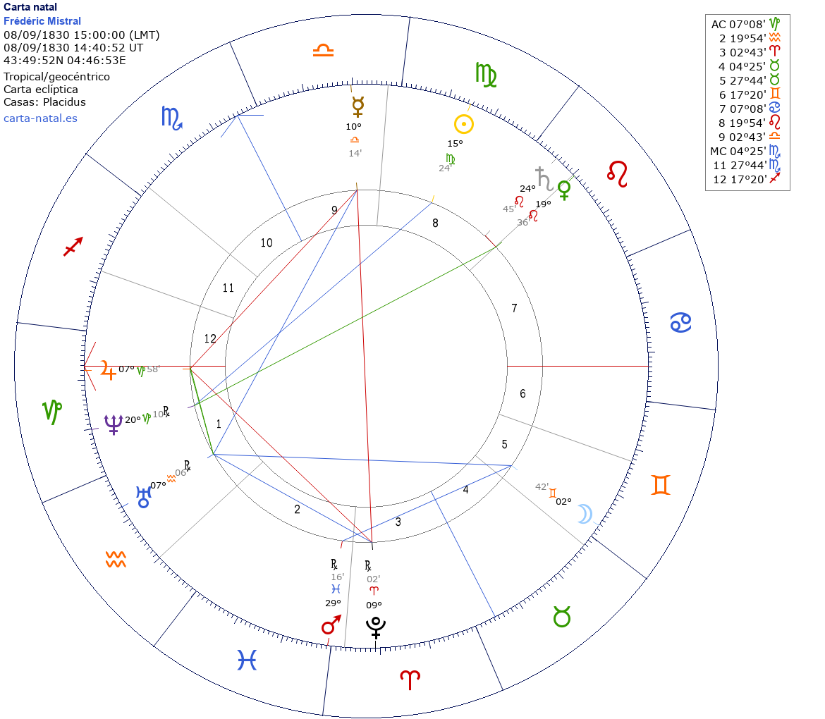Frédéric Mistral nació el 8 de Septiembre de 1830 a las 15:00:00 en Maillane (Provenza-Alpes-Costa Azul), Francia