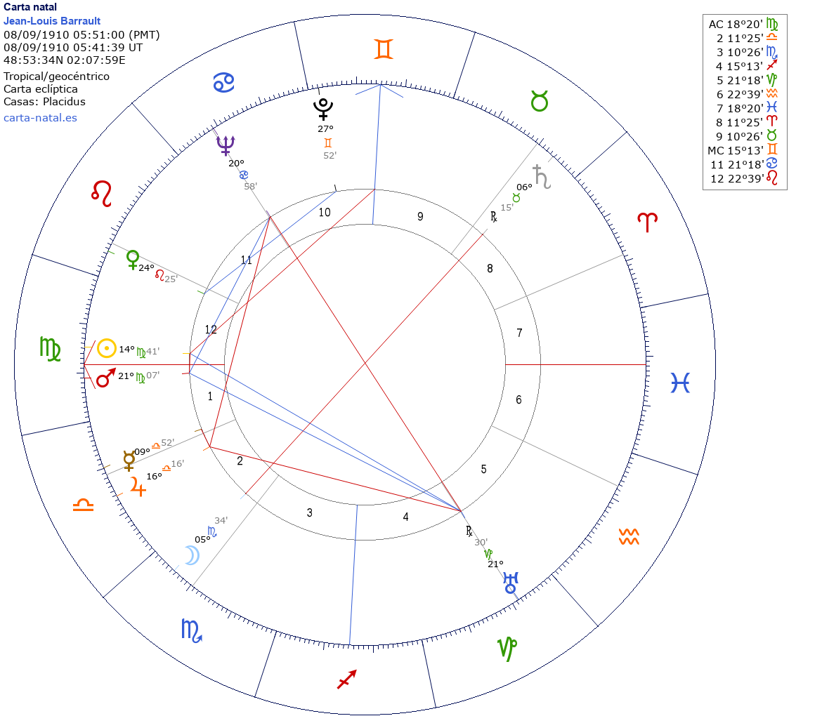 Esta es la carta natal de Jean-Louis Barrault, actor y mimo francés.