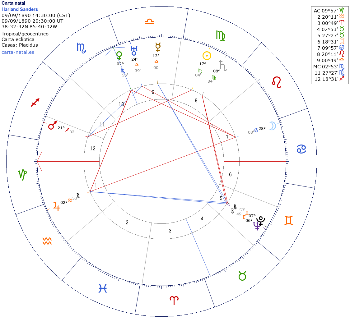 Harland Sanders nació el 9 de Septiembre de 1890 a las 14:30:00 en Otisco (Clark IN), Estados Unidos
