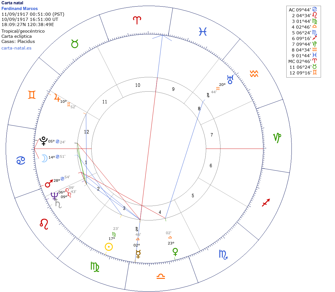 Ferdinand Marcos nació el 11 de Septiembre de 1917 a las 00:51:00 en Sarrat (Ilocos), Filipinas