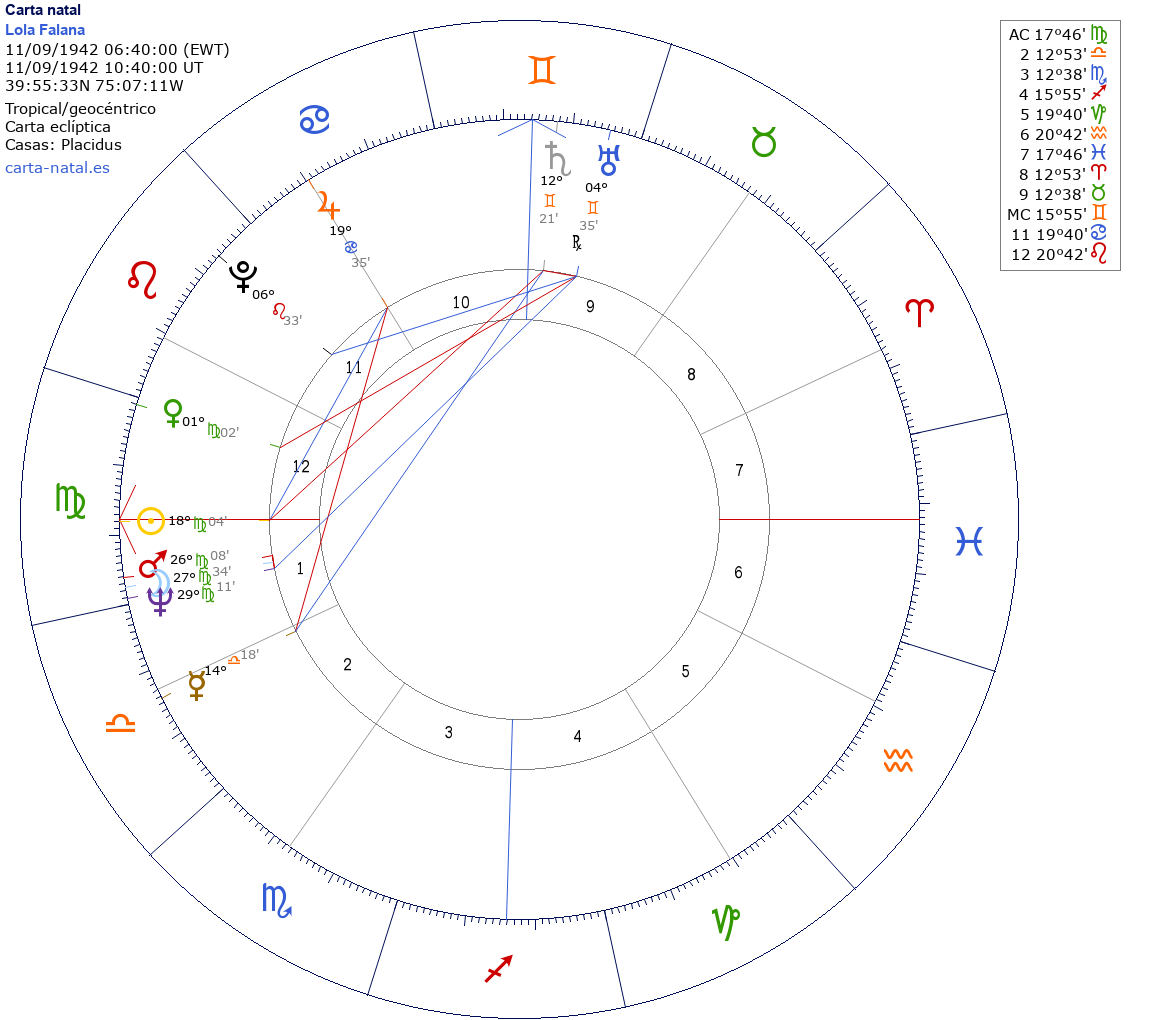 Esta es la carta natal de Lola Falana, cantante estadounidense.