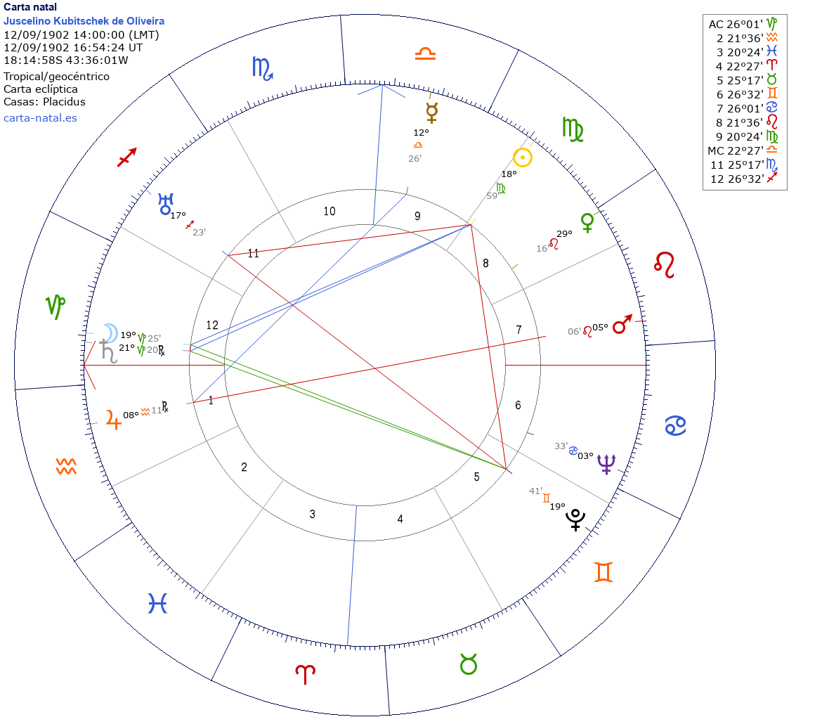 Juscelino Kubitschek de Oliveira nació el 12 de Septiembre de 1902 a las 14:00:00 en Diamantina (Minas Gerais), Brasil